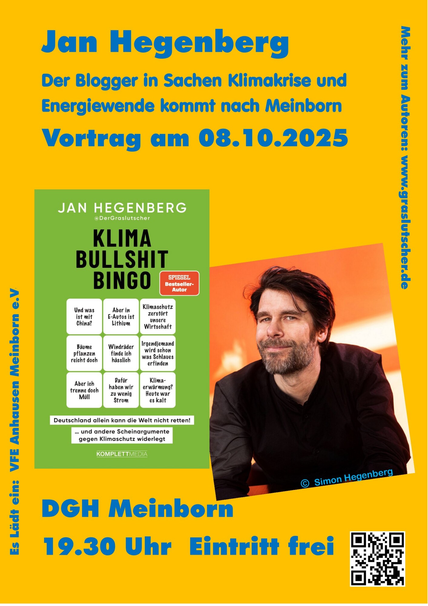 Am Mittwoch, 08. Oktober 2025 um 19:30 Uhr findet im Dorfgemeinschaftshaus Meinborn eine besondere Veranstaltung statt: Jan Hegenberg, bekannt als „Der Graslutscher“, wird aus seinem Bestseller „Klima Bullshit Bingo“ lesen und dabei mit viel Humor und faktenbasierter Unterhaltung die beliebtesten Klima-Ausreden entlarven.